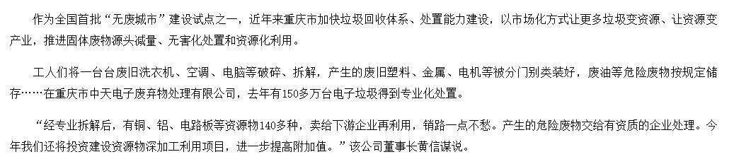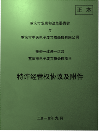 從2010年開始,公司就是重慶市政府公開招投標確定的重慶市電子廢棄物處理特許經營權企業,在重慶市“一小時經濟圈”范圍內23個區縣,開展電子廢棄物綜合回收機處理處置業務。